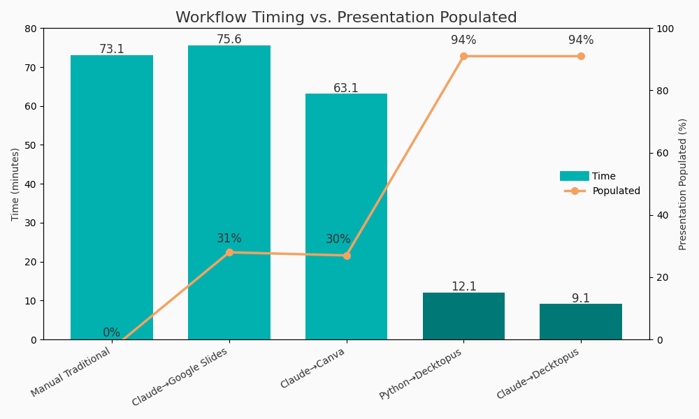 Claude → Decktopus: 9.1 min average (94-96% accuracy, 94% content population, 96% design quality)