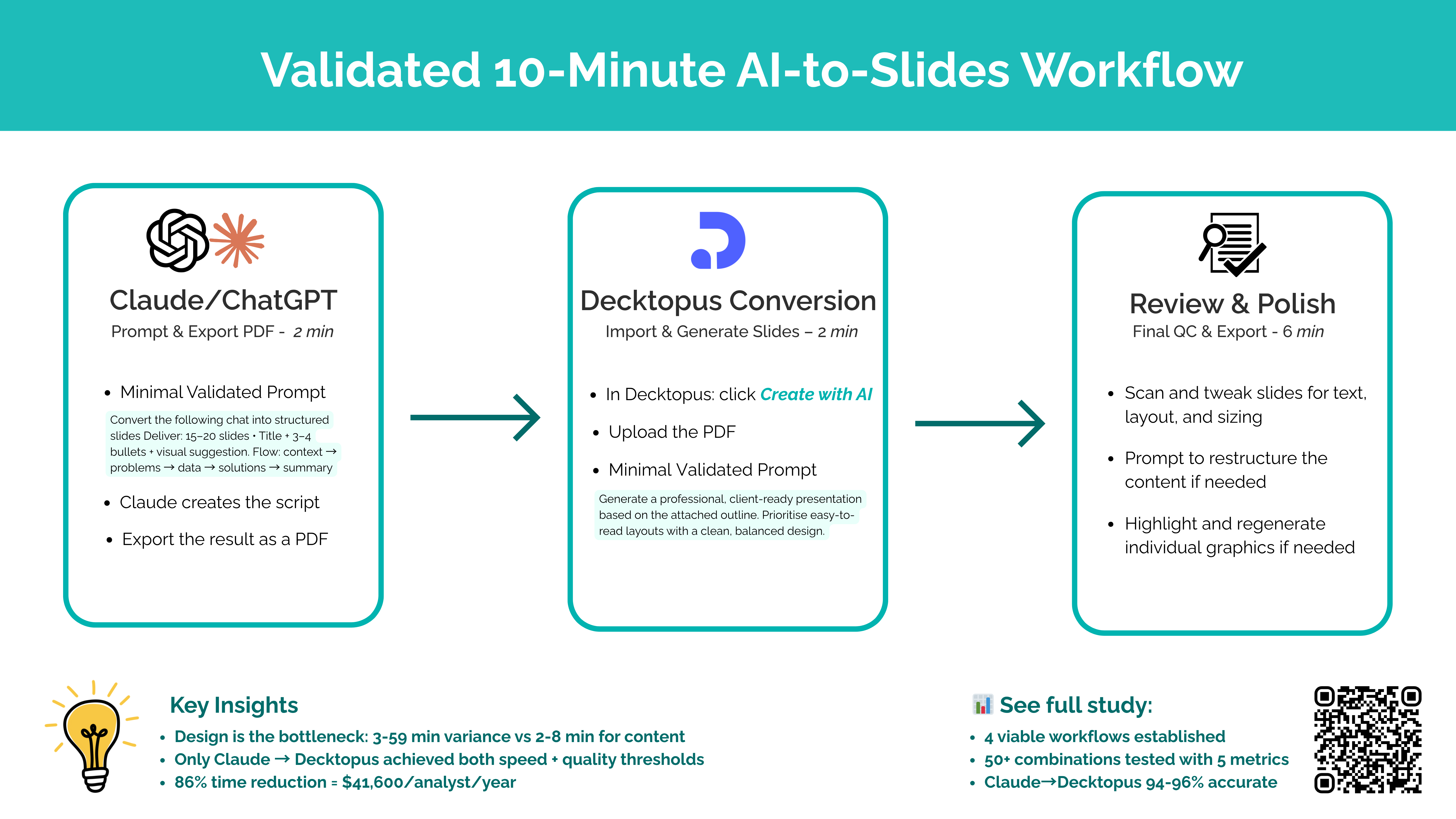 Phase 1: Claude Content (2 min) Phase 2: Decktopus Design (2-3 min) Phase 3: Human Polish (5-6 min) Total: 10 minutes consistently across 200 production decks