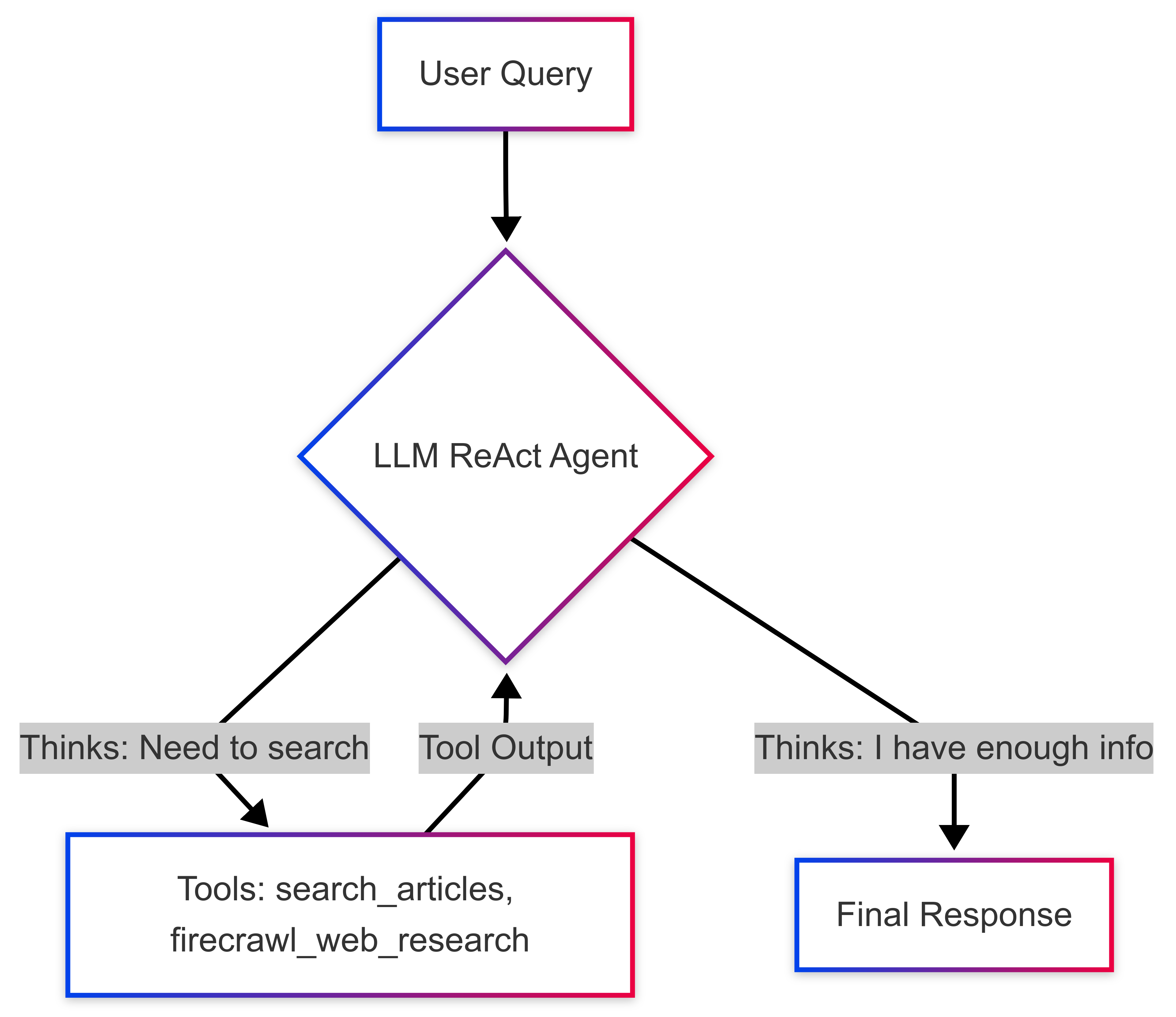 The idea is to empower a single LLM to act as a reasoning engine. It receives the user's query, "thinks" about which tool (if any) could help answer it, executes that tool, observes the result, and repeats this loop until it has enough information to generate a final response. It's simple, elegant, and often, the first thing people try.