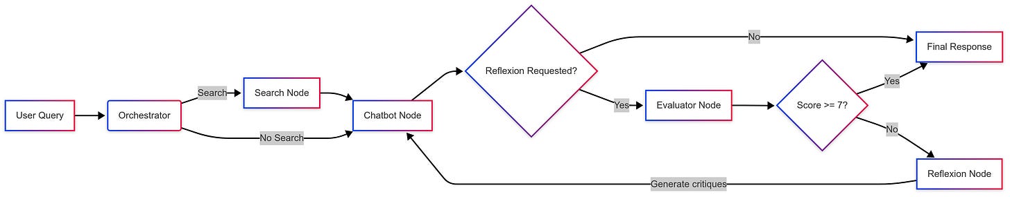 This architecture extends the manual pipeline with a "Reflexion" loop. After the Chatbot