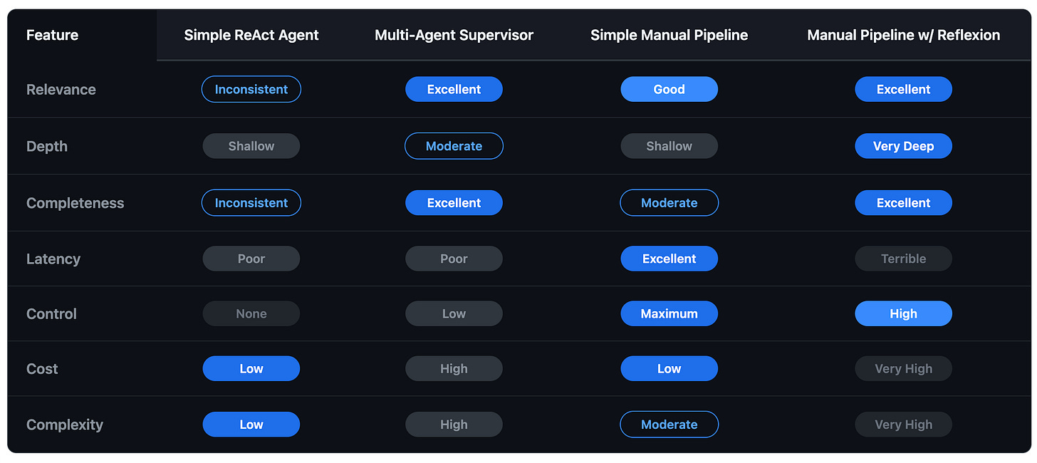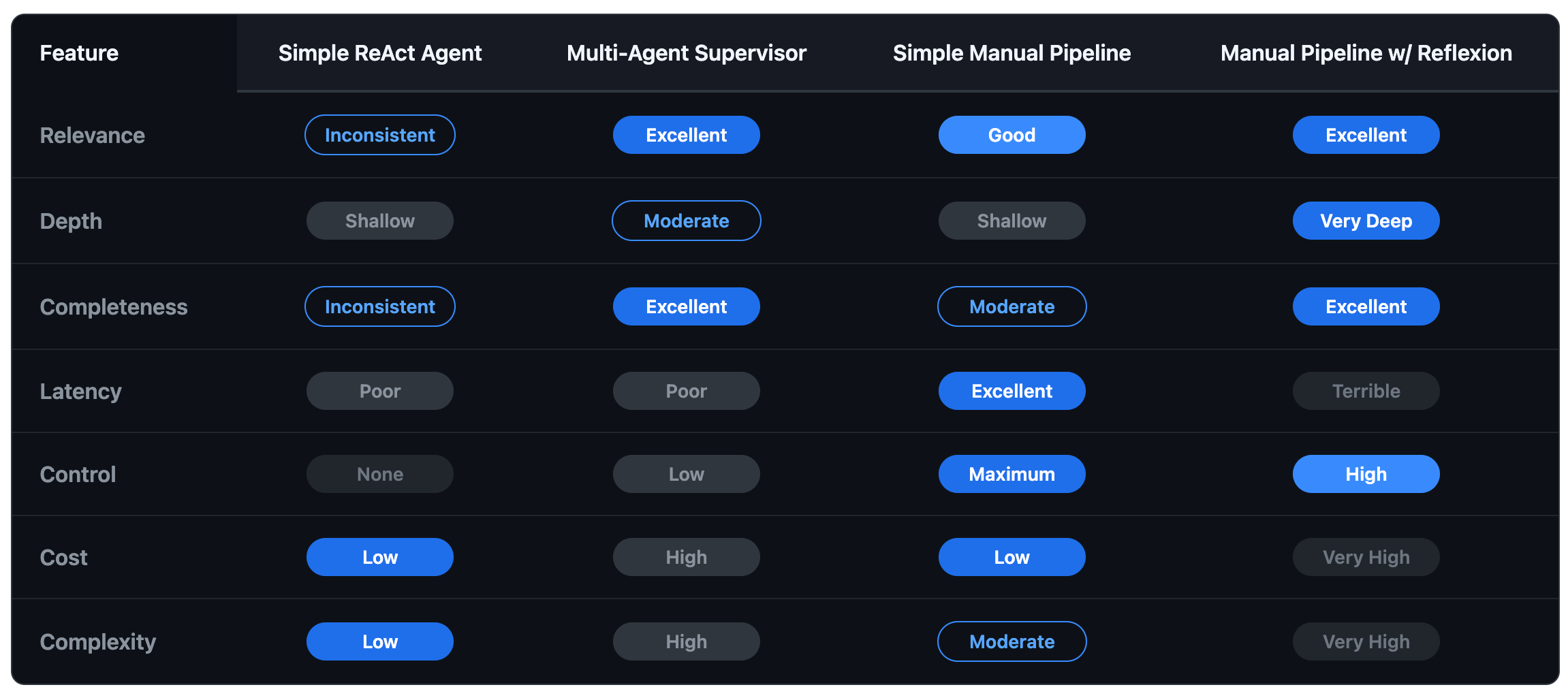 Depth of Response: Almost always shallow. ReAct agents are typically optimized to find an answer and stop, not to synthesize deeply.