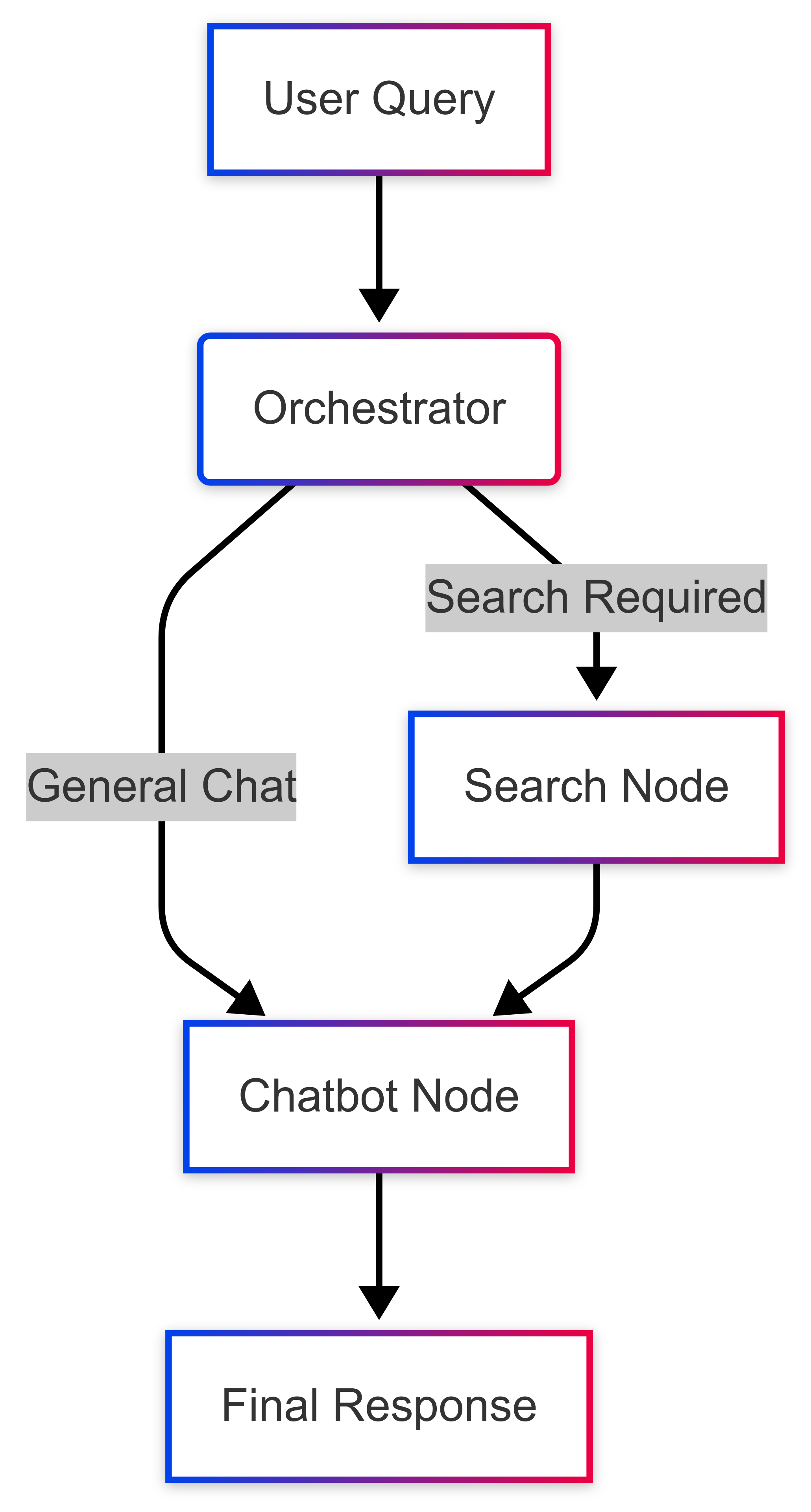 Using LangGraph, I built a stateful graph that functions like a highly controlled flowchart. A central Orchestrator node acts as a smart router, analyzing the user's intent upfront. Based on its decision, the query is routed to a dedicated Search node or a general Chatbot node. This eliminates guesswork; the model doesn't decide whether to search, it just executes the step it's told to.