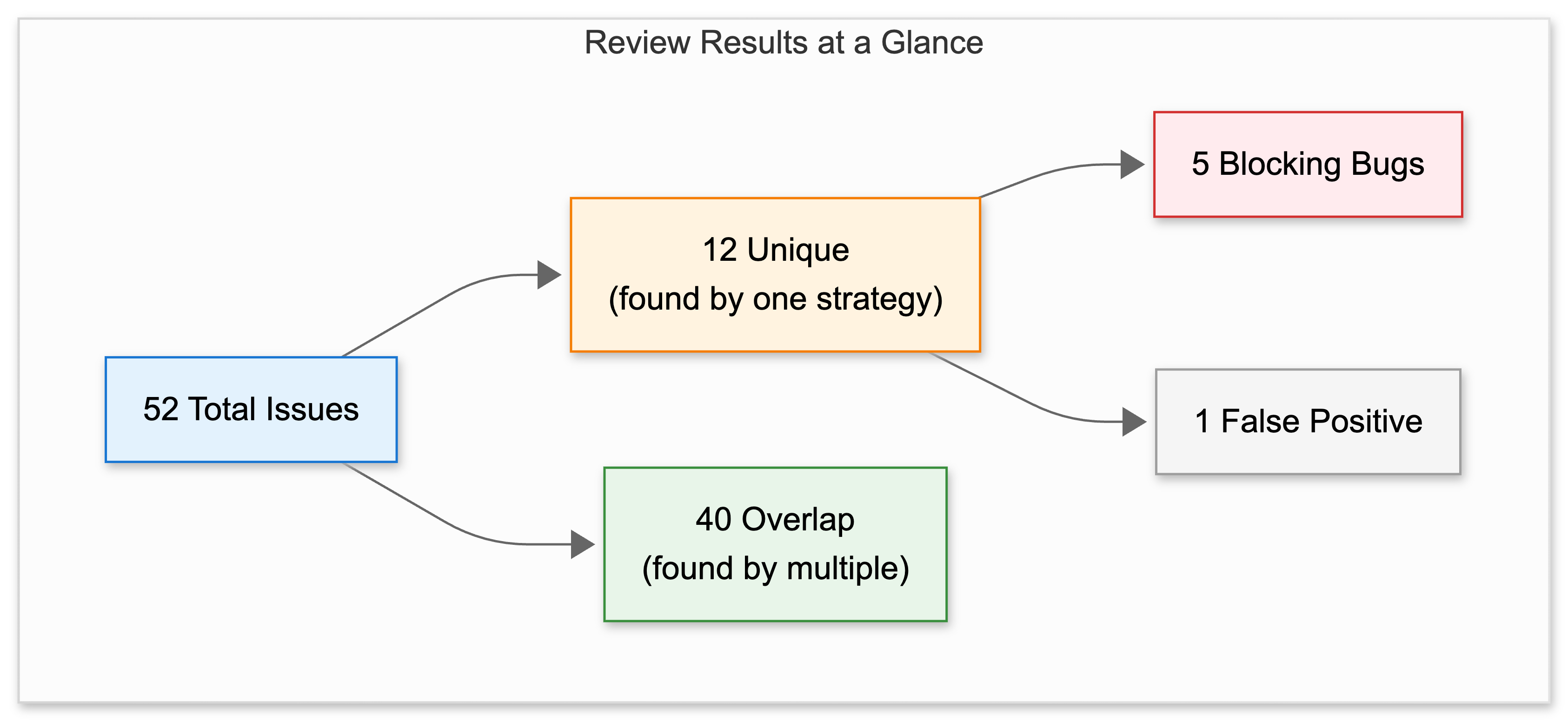Overlapping findings increase confidence. 40 issues flagged by multiple strategies = low false positive rate. When all three agree, it’s probably real.