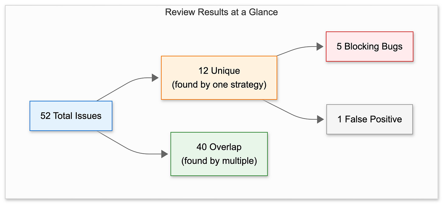 The three strategies flagged 52 issues total. Of those, 40 were found by multiple strategies (useful validation), but 12 were unique to a single approach. Five of those 12 would have broken production. Only one was a false positive.