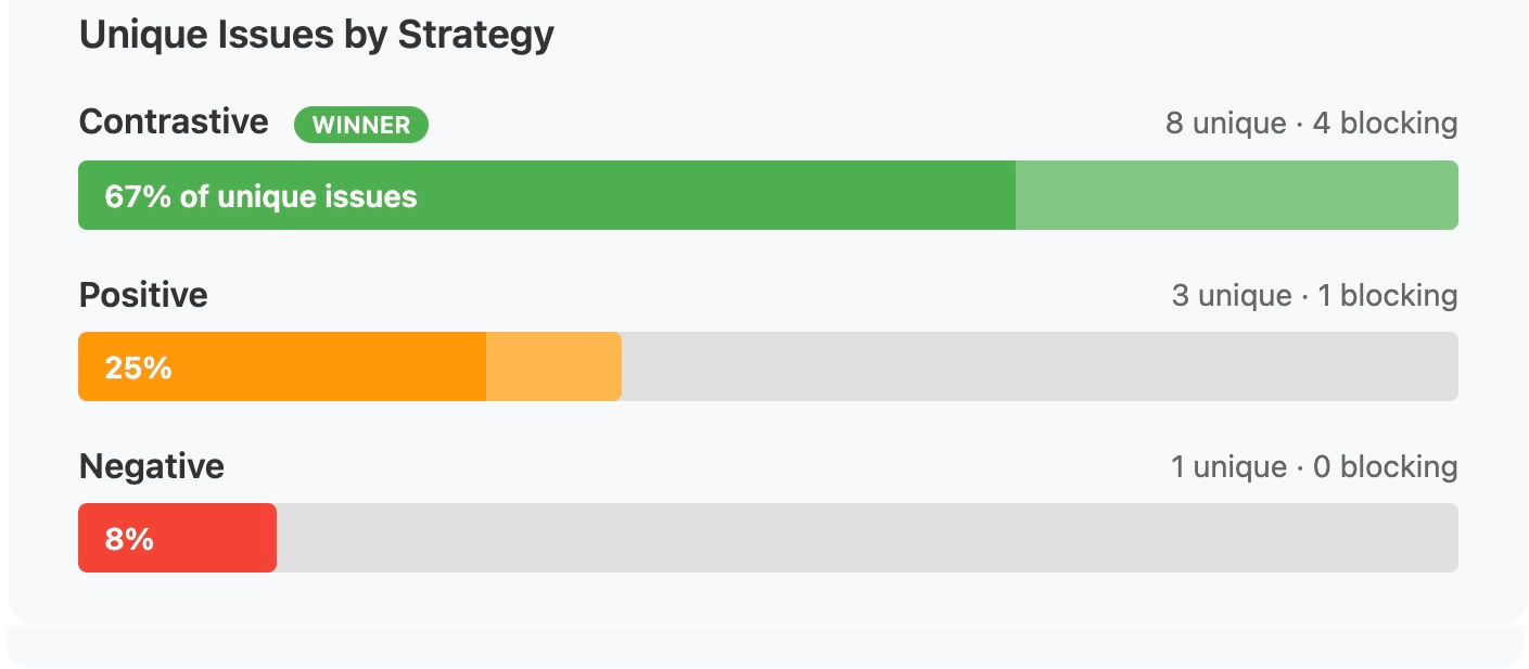 Here’s where it gets interesting: Contrastive prompting found 8 of the 12 unique issues, including 4 of the 5 blocking bugs. Positive found 3 unique issues (1 blocking). Negative found just 1 unique issue (0 blocking).