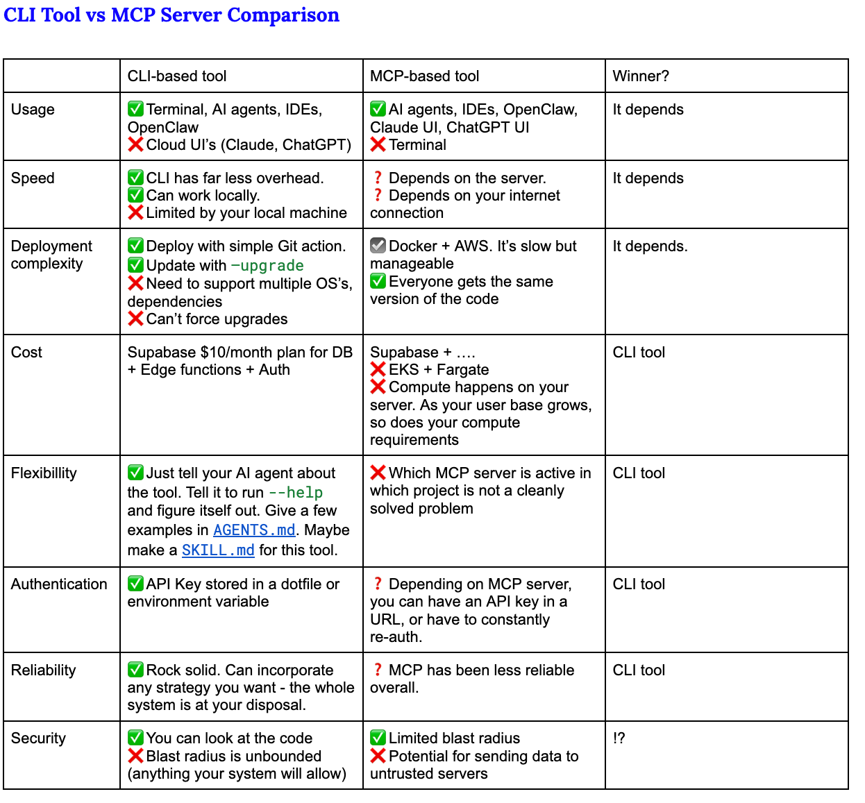 As a quick aside, I LOVE the Supabase MCP server. It is an example of MCP done right. It has a useful set of tools, but using it does not seem to take up an inordinate amount of tokens. Its pretty cool to be able to add columns, do SQL migrations, and deploy edge functions easily from within an AI agent. Using the Supabase MCP server when developing your Supabase-backed CLI tool will make life easier for you.