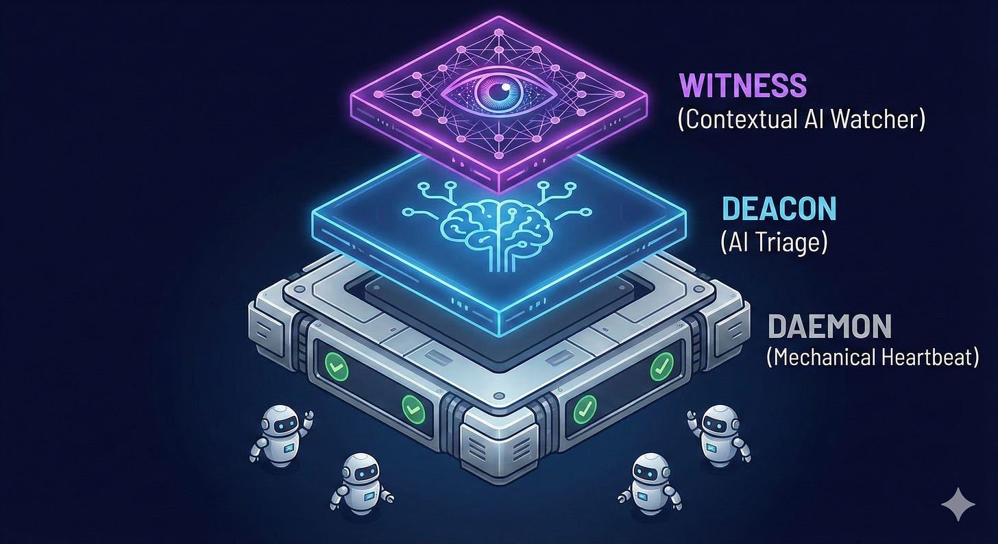 Gastown solves this by putting AI in the patrol loop. “The Witness” isn’t a bash script; it’s an AI agent that makes judgment calls about other agents based on a hierarchy of graduated intelligence: