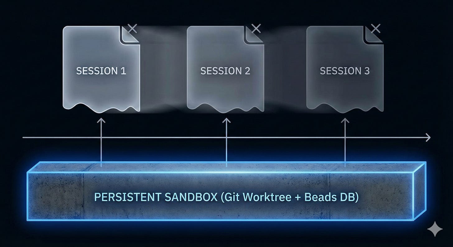 Gastown treats the session as disposable. Instead, the Sandbox (the git worktree, the branch, and the “beads”) is what persists.