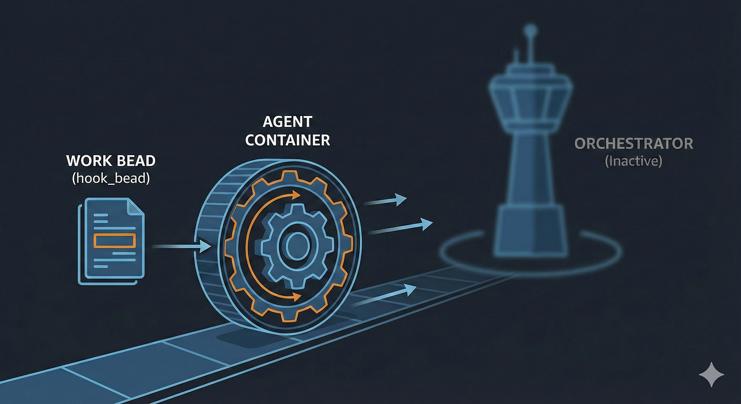 Work is written to an agent’s hook_bead. When a session starts, that hook fires automatically, and the agent begins executing the work. There is no orchestrator bottleneck constantly managing the loop.