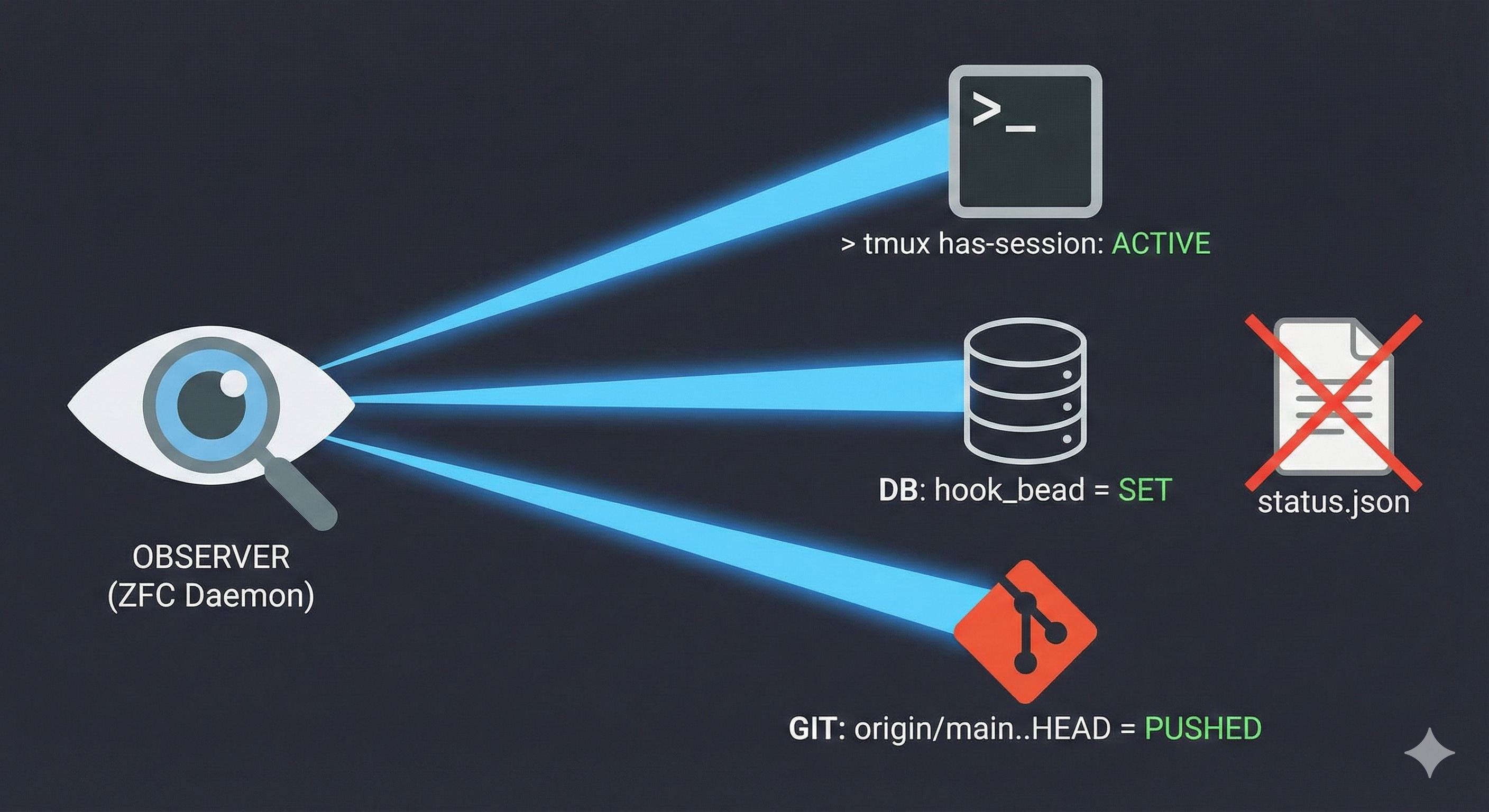 Gastown operates on a principle called ZFC (Zero-File-Config). It doesn’t track state in files; it observes reality directly.