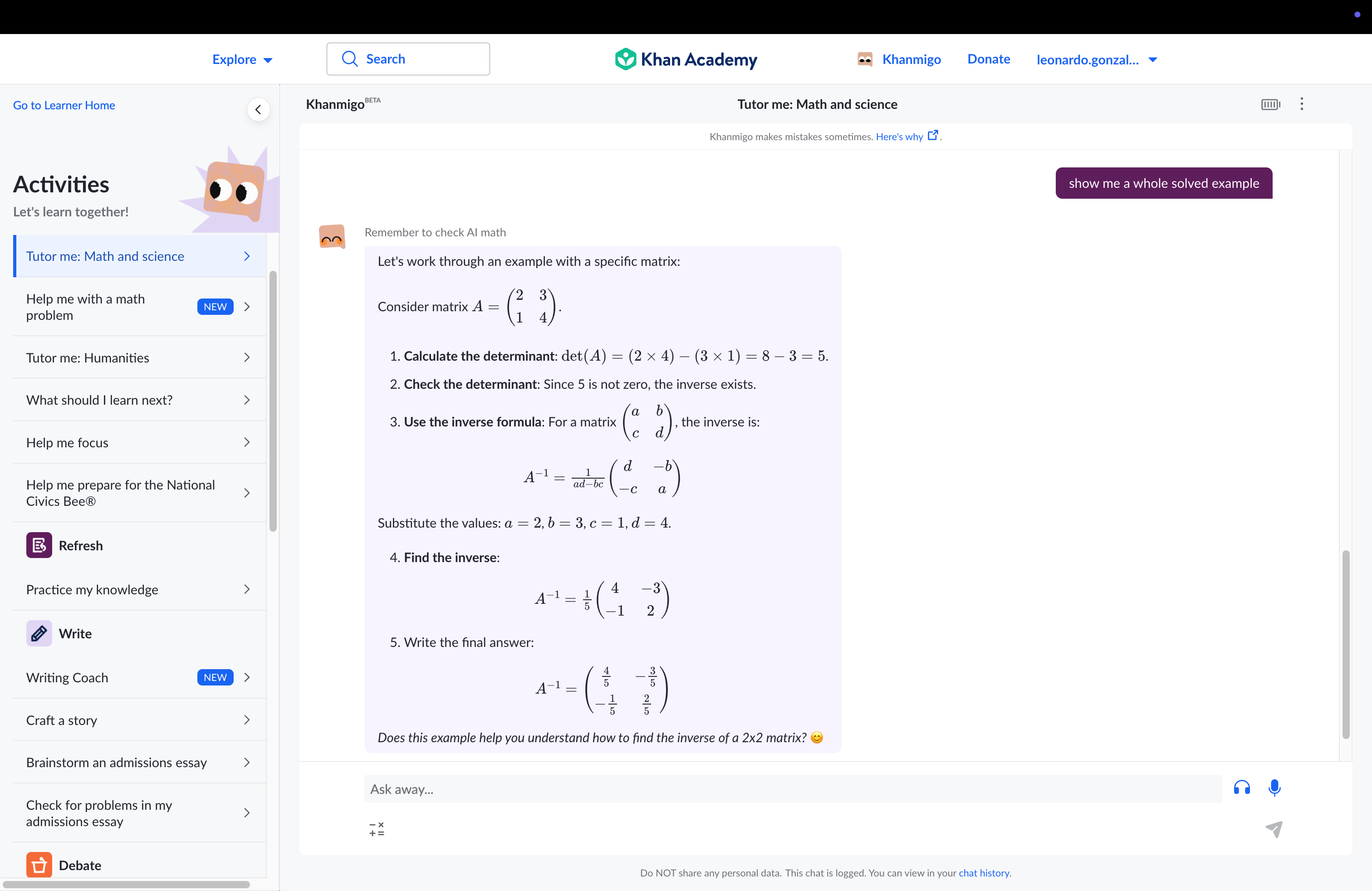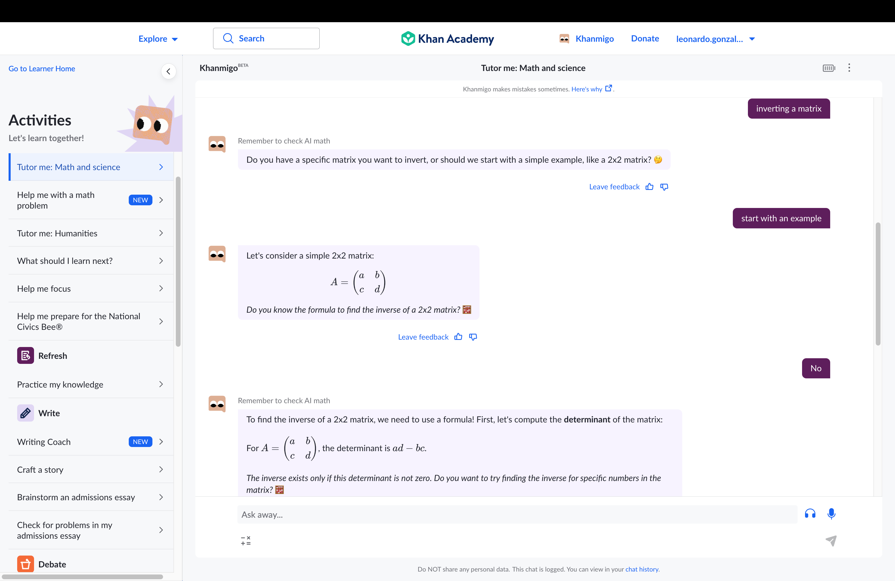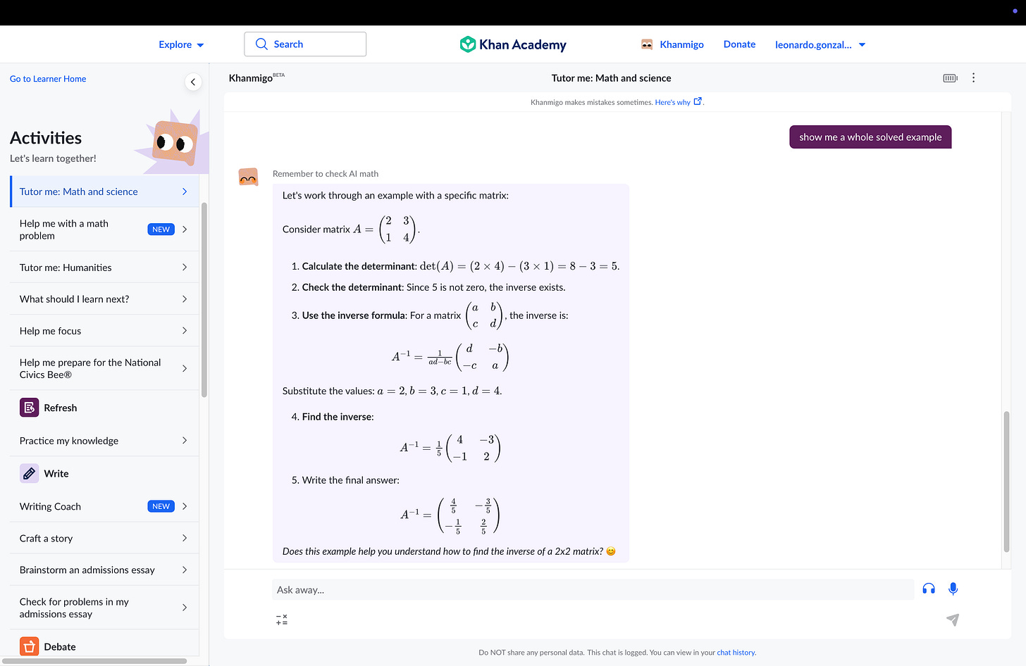 Khan Academy. (n.d.). Khanmigo for Learners: Always-Available Tutor, Powered by AI. Khan Academy. https://khanmigo.ai/learners
