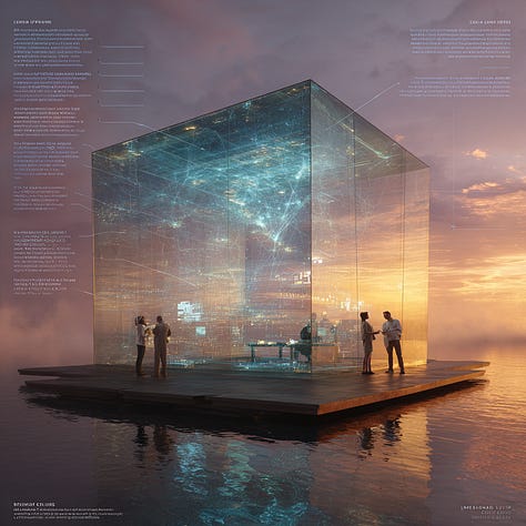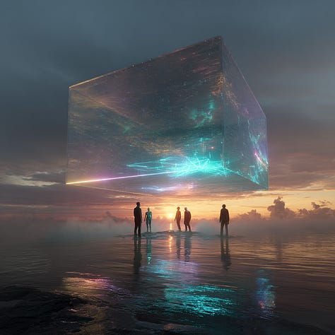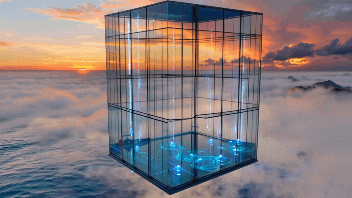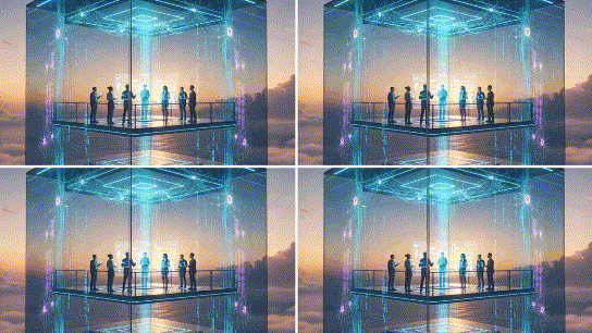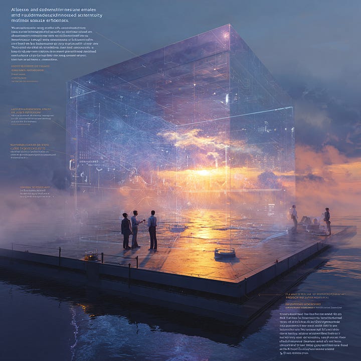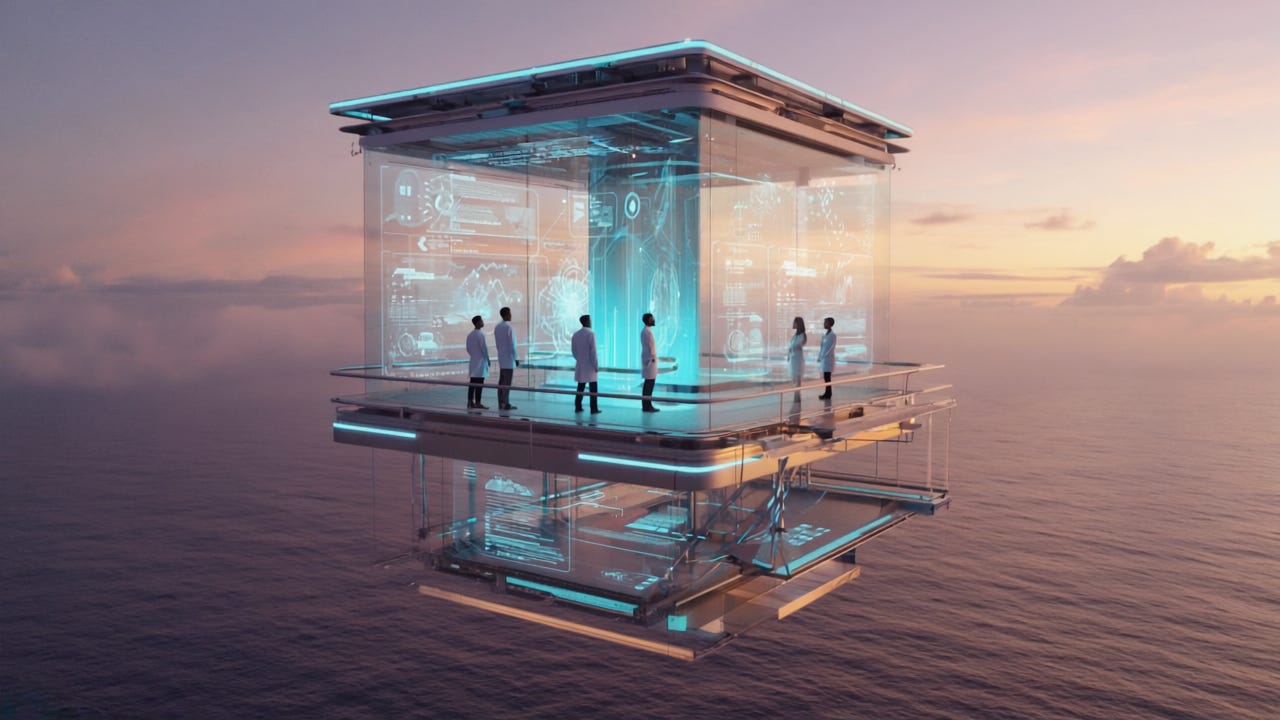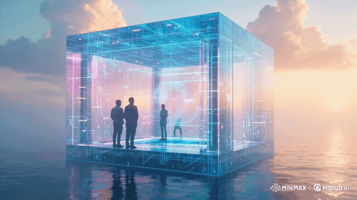 “A futuristic AI research center housed inside a massive glass cube floating above a misty ocean at sunrise. The structure glows with soft cyan and violet lights, and features visible floating data streams and neural network patterns etched into its transparent walls. On the main observation deck inside the cube, four diverse researchers (men and women) are gathered around a levitating holographic interface, reviewing a real-time AI model visualization. The mood is quiet awe and innovation. The sky is gradient pink-orange with low hanging clouds and soft golden light reflecting off the water. Cinematic ultra-wide shot, shot on a 35mm lens. High contrast. Style: hyperrealistic with subtle painterly textures. Think Denis Villeneuve meets Moebius. Include lens flares, volumetric lighting, and high detail reflections.”Video Prompt