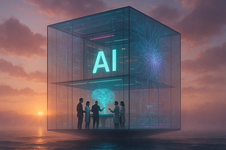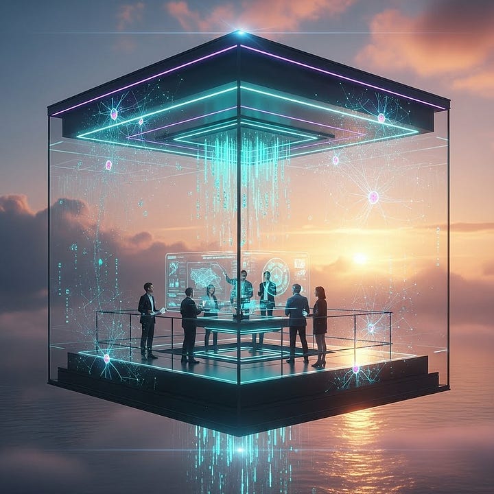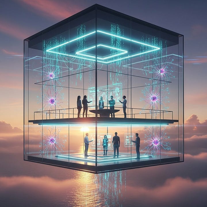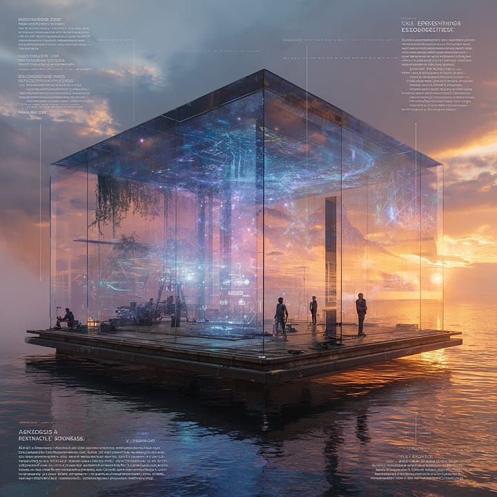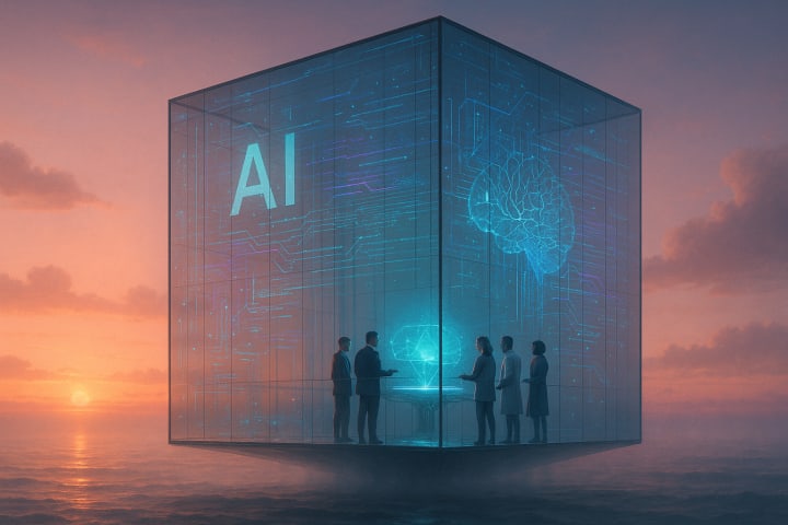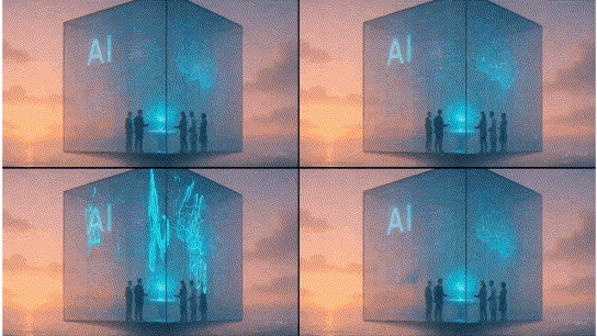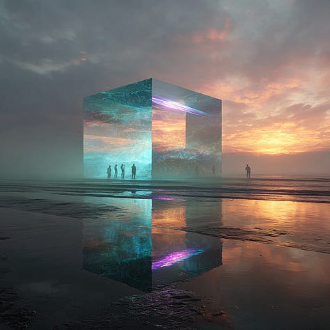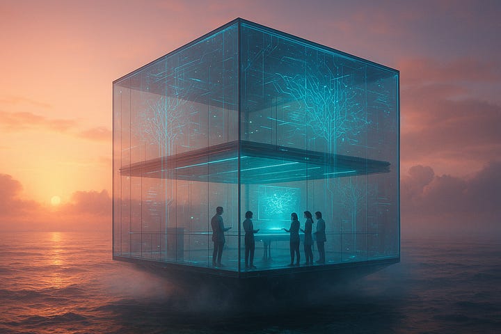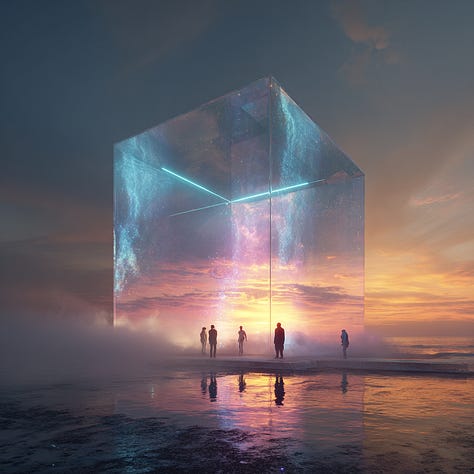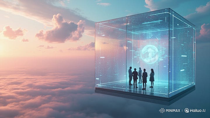 “A futuristic AI research center housed inside a massive glass cube floating above a misty ocean at sunrise. The structure glows with soft cyan and violet lights, and features visible floating data streams and neural network patterns etched into its transparent walls. On the main observation deck inside the cube, four diverse researchers (men and women) are gathered around a levitating holographic interface, reviewing a real-time AI model visualization. The mood is quiet awe and innovation. The sky is gradient pink-orange with low hanging clouds and soft golden light reflecting off the water. Cinematic ultra-wide shot, shot on a 35mm lens. High contrast. Style: hyperrealistic with subtle painterly textures. Think Denis Villeneuve meets Moebius. Include lens flares, volumetric lighting, and high detail reflections.”Video Prompt
