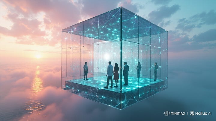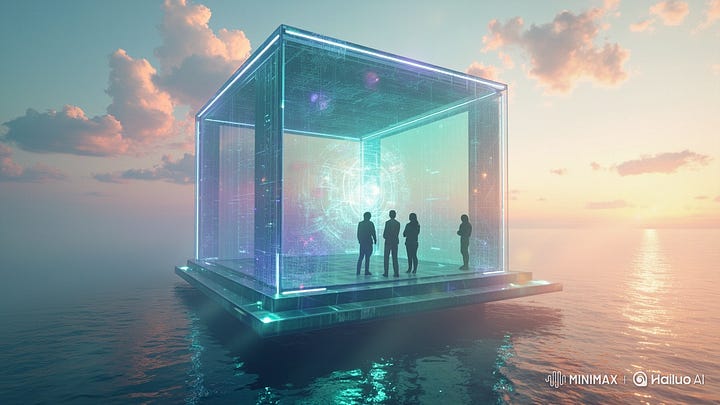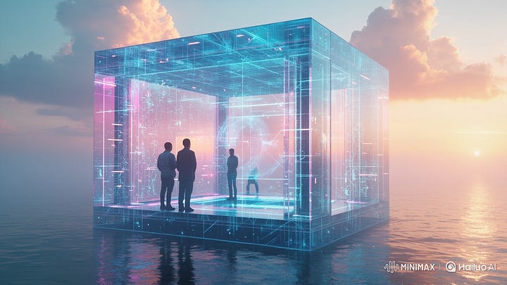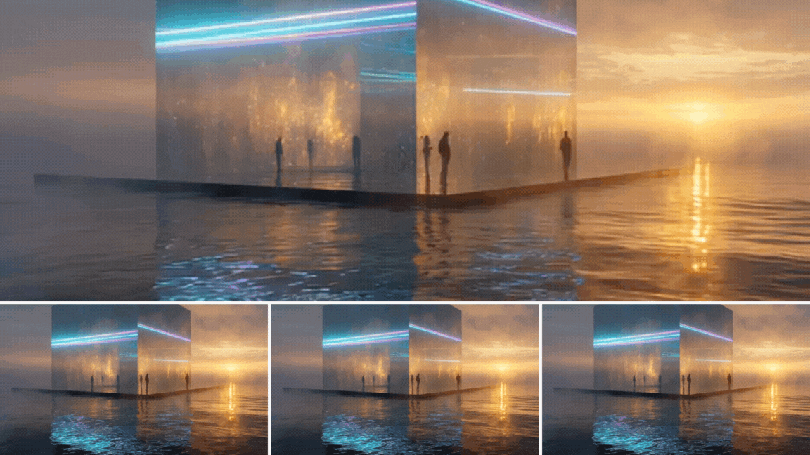 “Create a cinematic video sequence (10–20 seconds) starting with a wide aerial shot of a massive glass cube floating above a misty ocean at sunrise. The camera slowly descends toward the cube, revealing glowing cyan and violet light streams running across its transparent surfaces. As the shot transitions inside the cube, the scene reveals four diverse AI researchers standing around a levitating holographic interface. They interact with floating model visualizations and gesture toward shifting neural network patterns. Mist swirls at the base of the cube while soft ambient music builds in the background. The sunrise sky evolves from pink-orange to golden yellow, reflecting light dynamically across the water. The mood is quiet awe and inspiration. Include smooth camera movement, volumetric lighting, lens flares, gentle motion of light streams, and subtle facial expressions. Cinematic style inspired by Denis Villeneuve and Moebius with a balance of realism and artistic stylization.”Results