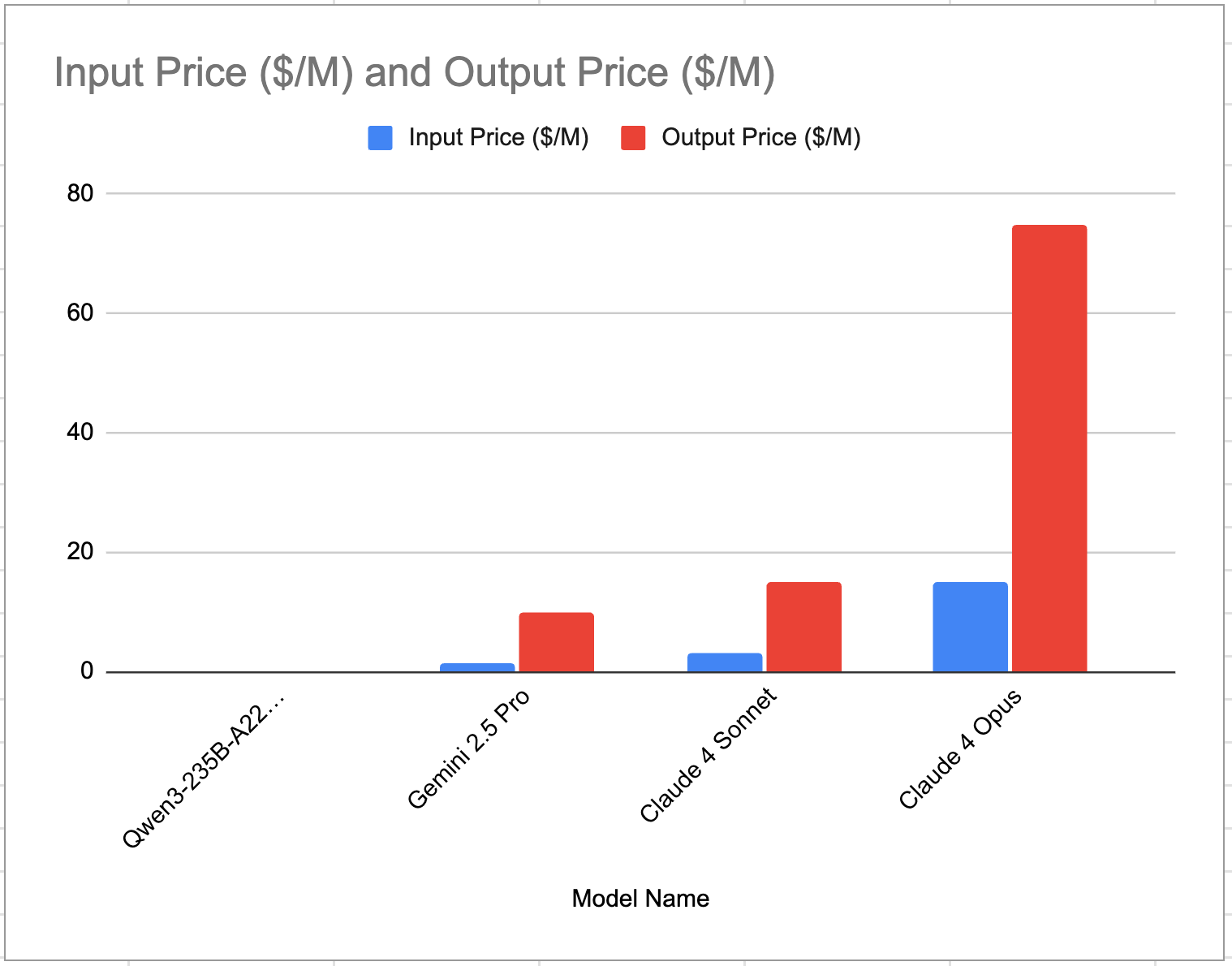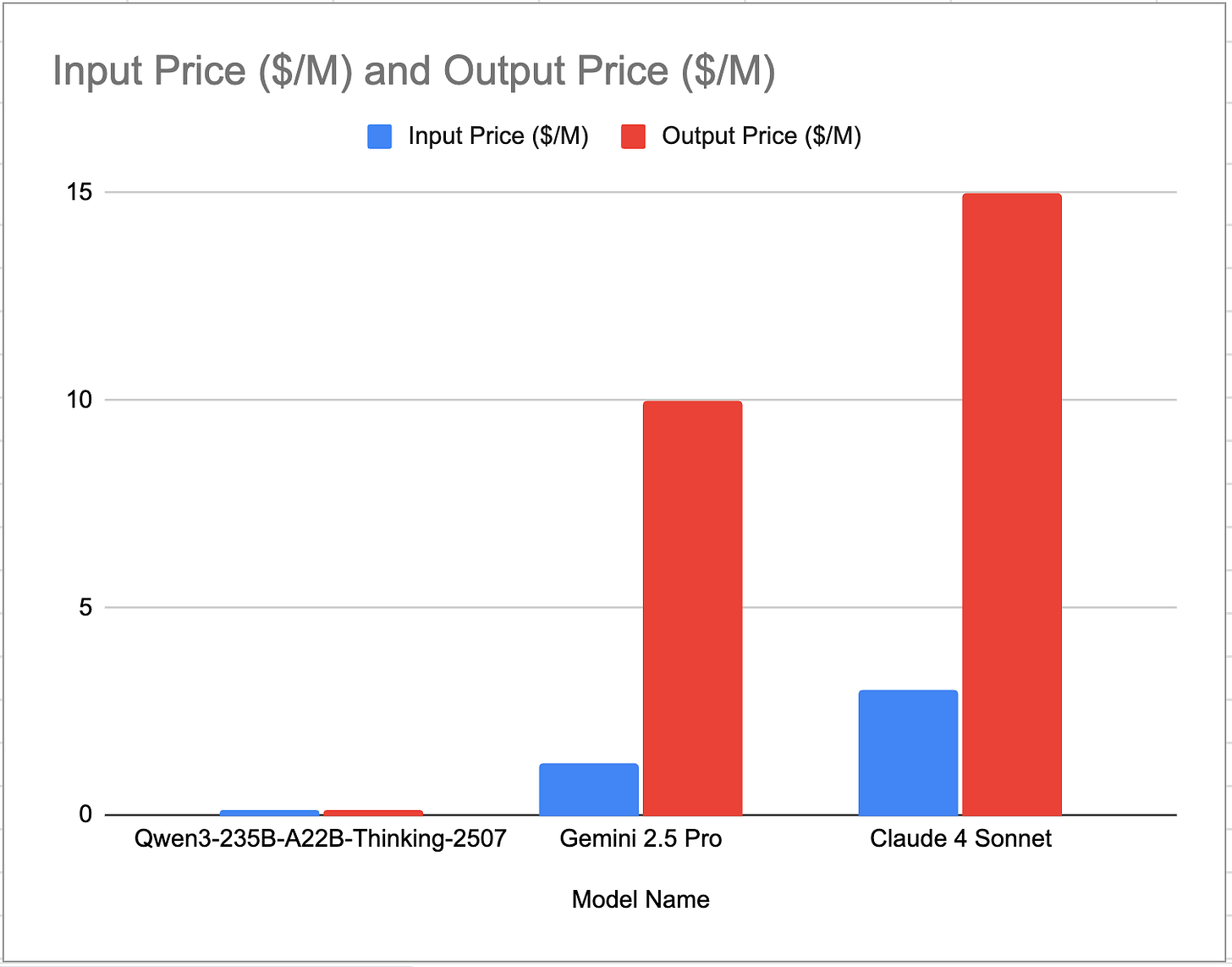 That's right: the Qwen3-235B-A22B-Thinking-2507 model (the one beating these other models in the previous bar chart) is so cheap, the price is practically zero! Let's remove Claude 4 Opus since its outrageous pricing is throwing off our y-axis: