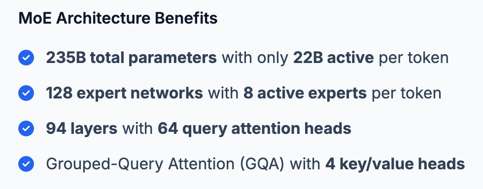 Mixture-of-Experts (MoE) on a Diet: All three models use an MoE architecture. Think of it like a massive library with hundreds of specialist librarians. When you ask a question, only the relevant experts (8 of them, in this case) get involved. So, while Qwen3-Coder has 480 billion parameters in total, it only uses about 35 billion for any single task. The 235B models only activate 22 billion. This means you get the knowledge of a huge model with the inference cost of a much smaller one. It's a massive efficiency win.