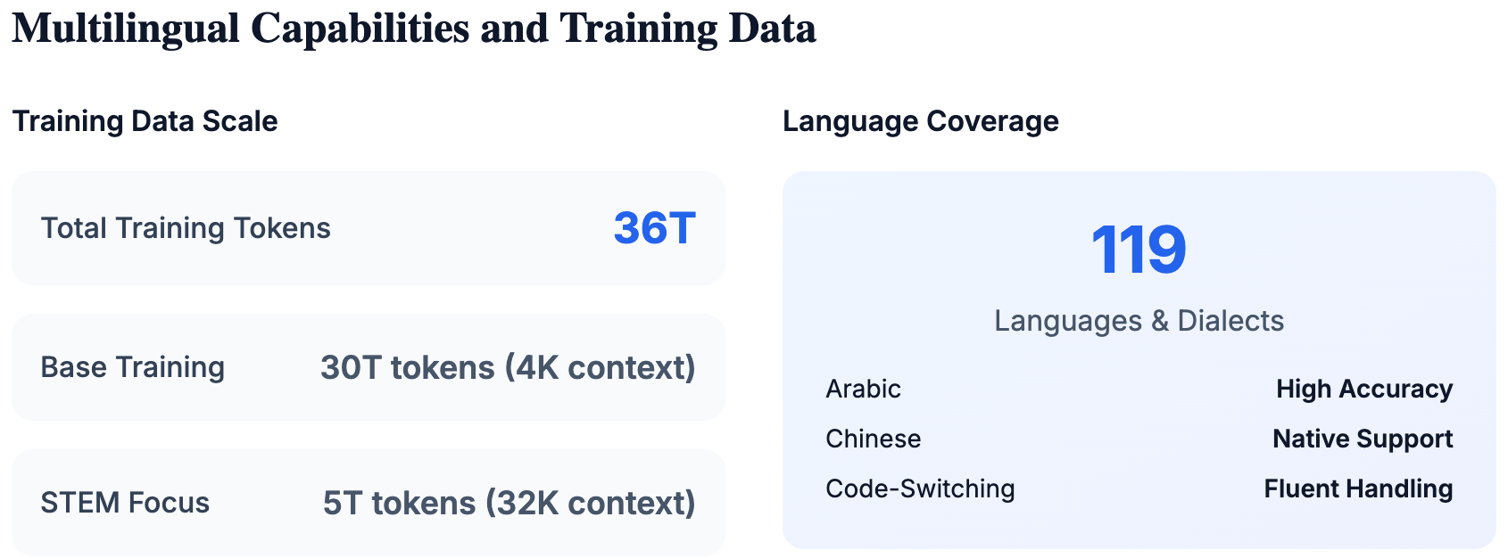 Multilingual Training Data: The model was trained on a vast 119 languages, with a major focus on non-Latin scripts and code-switching. So when your users start mixing languages mid-sentence, the model can adapt. This makes it ready for prime time in global markets, and its translation skills are top-tier.