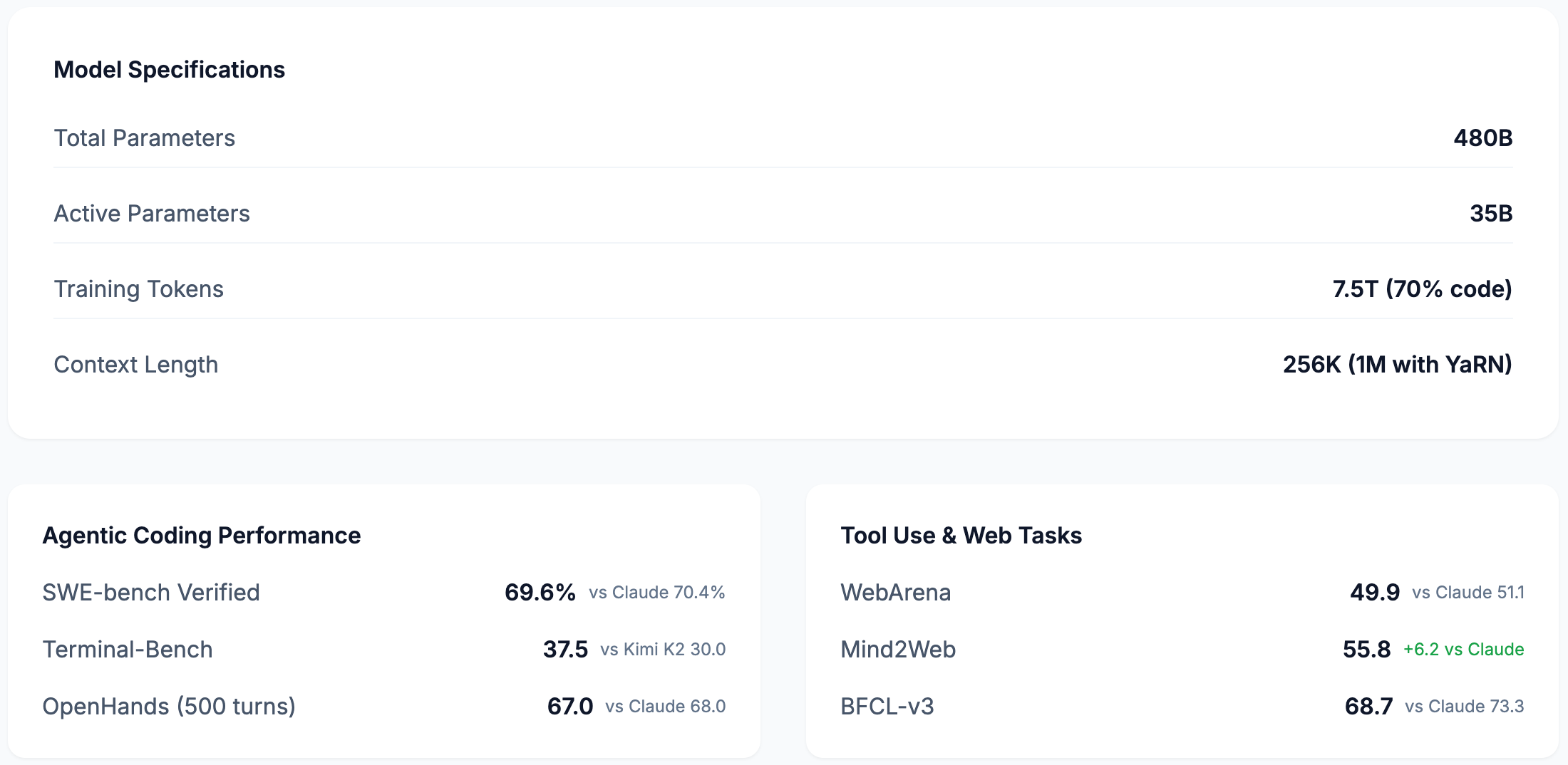 Qwen3-Coder-480B-A35B-Instruct: The heavyweight coding specialist. It's a massive 480-billion parameter model trained on a diet of 70% code.