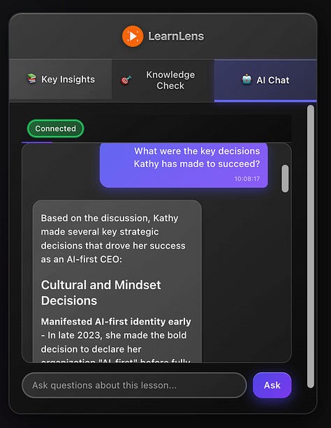 Our AI Center of Excellence interview with Kathy exemplifies the kind of dense, high-value content that LearnLens was built for. When executives share decades of experience in a single conversation, you need more than passive viewing to capture that knowledge.