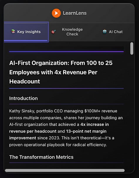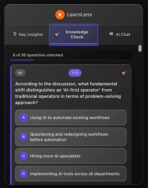 Not random pop-ups - strategically timed comprehension checks that reinforce critical concepts. When Kathy explains her “personal workflow first” principle, LearnLens verifies you understand why this matters before moving forward.