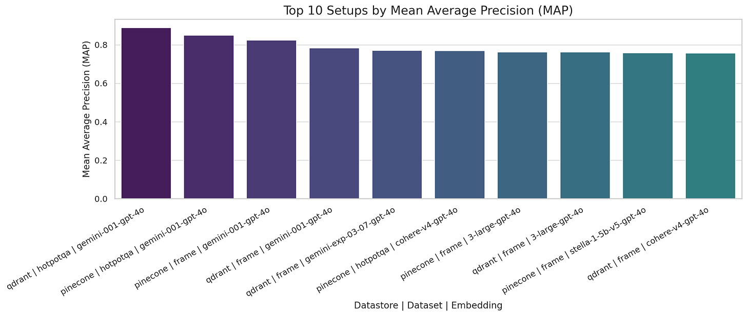 Gemini-001 with Qdrant and Pinecone leads MAP performance, especially on HotpotQA and FRAME datasets.