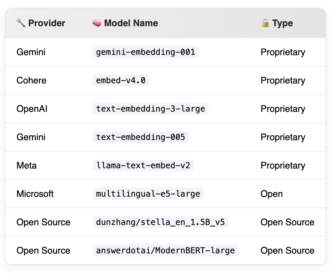 I used a selection of proprietary and open source models, that I largely curated from the MTEB leaderboard