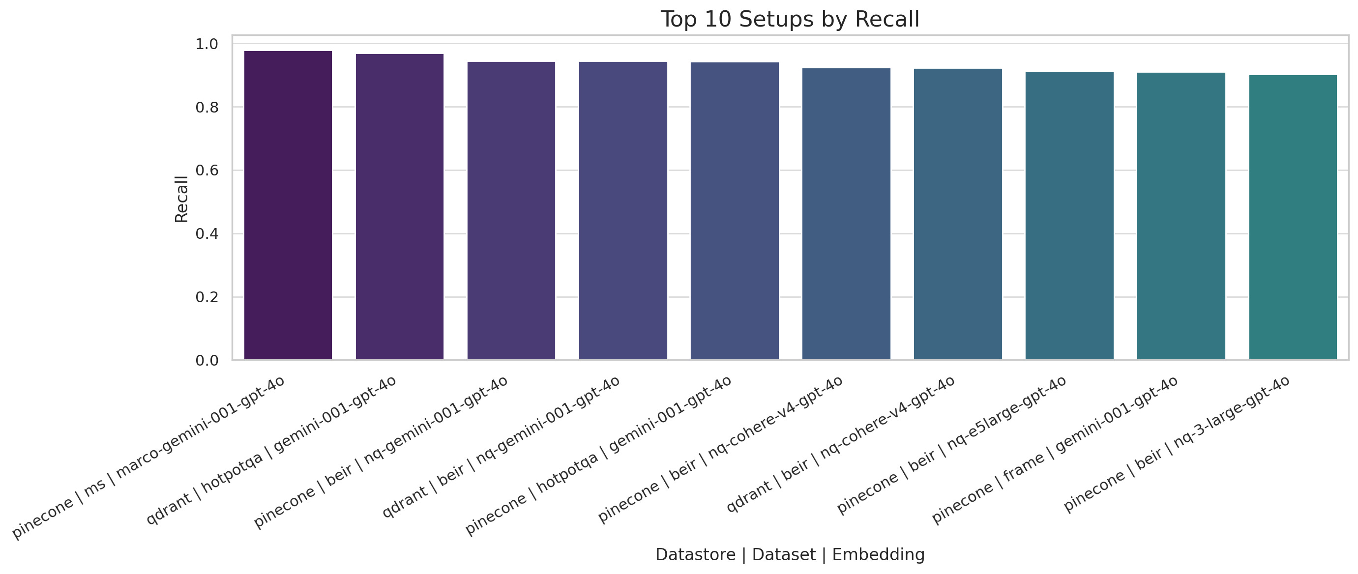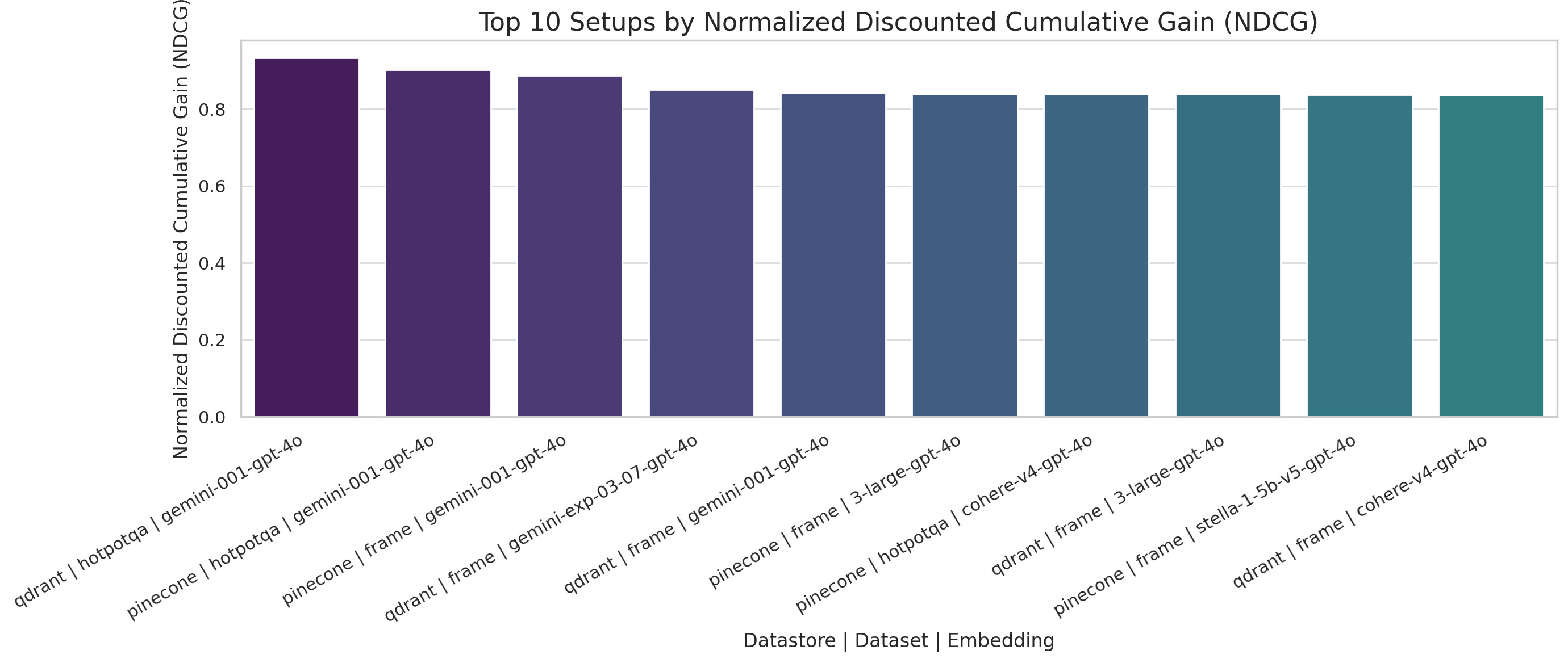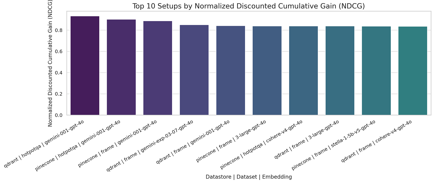 Top setups prioritize highly relevant documents early, with Gemini models again dominating across both stores.