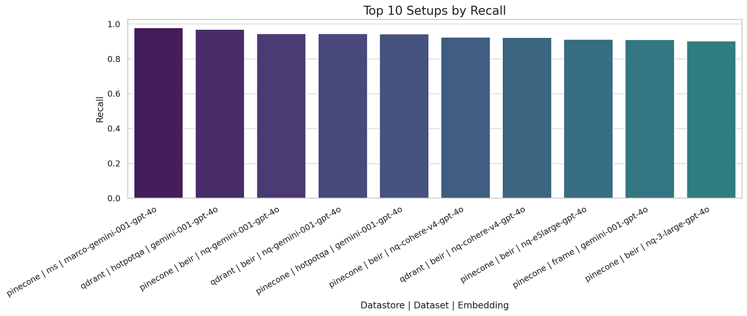 Pinecone and Qdrant achieve near-perfect recall using Gemini-001 across diverse datasets including MS Marco, BEIR, and HotpotQA.