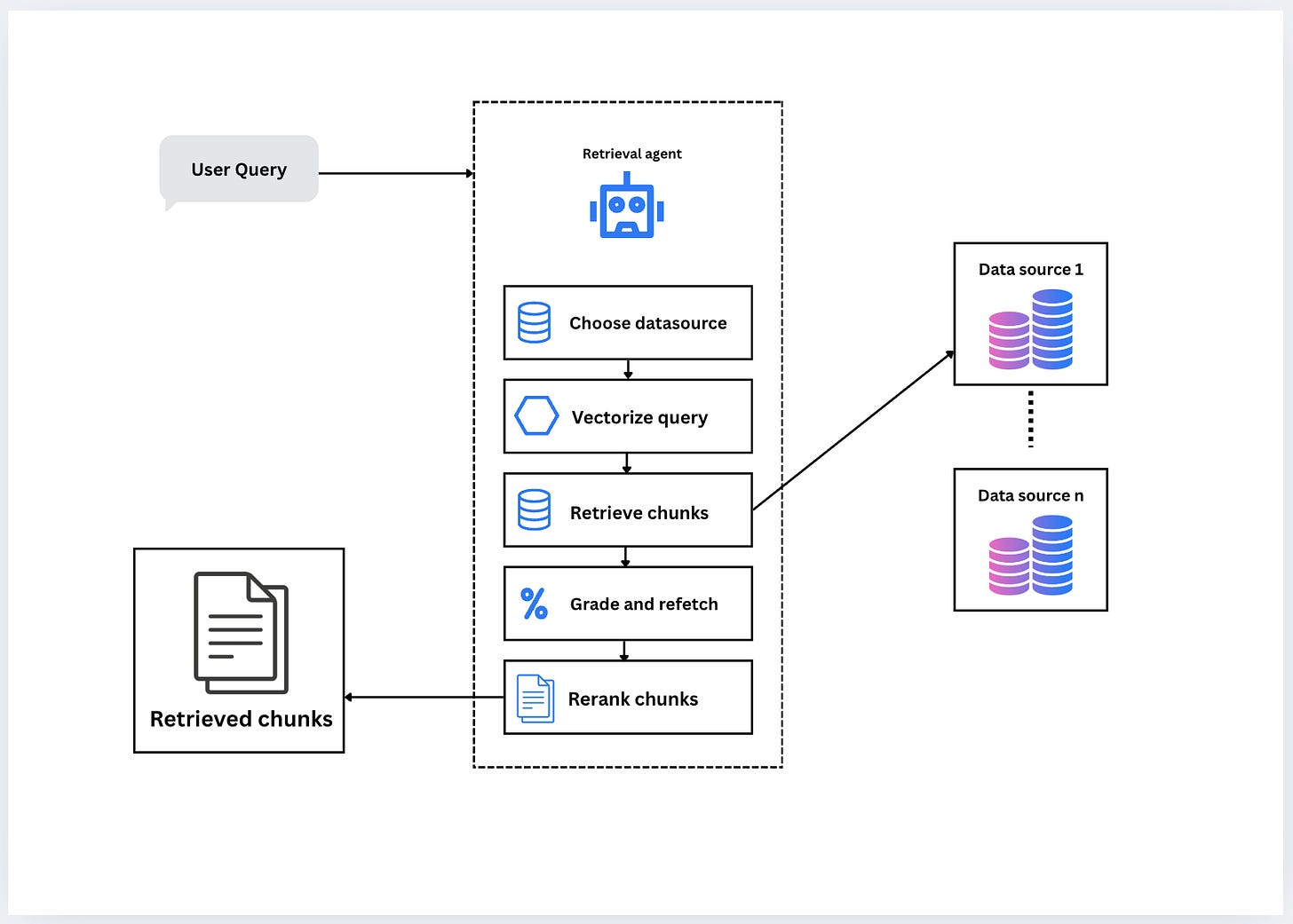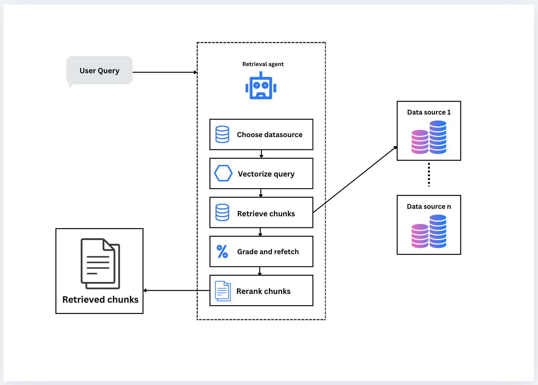 Grade and Refetch: Rather than settling for the first result set, the agent assesses quality (e.g., relevance, coverage) and may re-query or switch sources as needed.