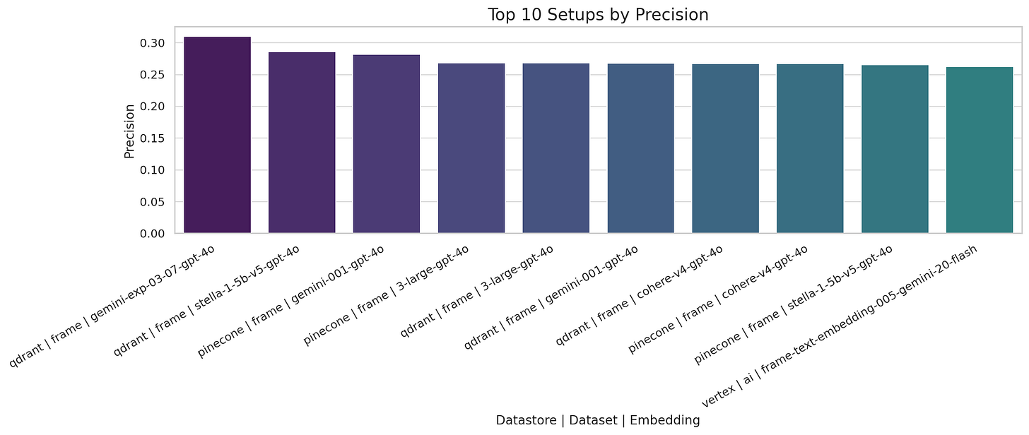 Experimental Gemini and Stella models yield the highest precision, particularly when paired with Qdrant on FRAME.