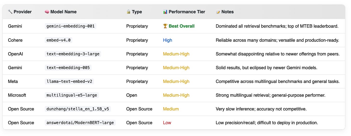 is the clear winner, leading across every metric, and strongly correlating with top performance on public benchmarks like MTEB. The single drawback with them is that the current vertex API allows only one document per embedding request, making it excruciatingly slow. However I expect this will change very soon.Cohere’s newer models also perform well, offering a solid balance of speed and accuracy.